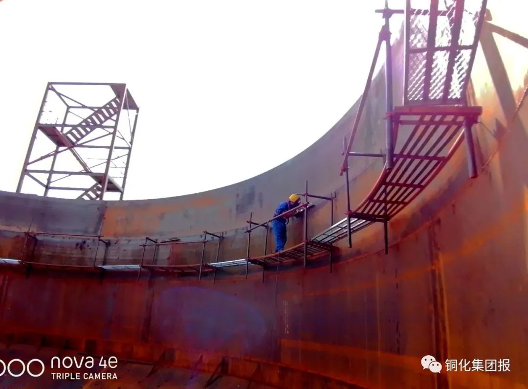 為促進礦山綠色發(fā)展,新橋礦業(yè)公司投資近2200萬元,對全尾砂充填系統(tǒng)進行技改。該工程于2月動工,預(yù)計7月底收官運行。屆時,選礦廠、選鐵廠生產(chǎn)尾砂及污水處理站淤泥經(jīng)混合處理可全部用于井下充填,實現(xiàn)礦山生產(chǎn)固廢零排放。圖為5月21日,工人正在施工現(xiàn)場焊接直徑18米的深錐濃密池?!√丶s記者/ / 朱常林/ / 攝