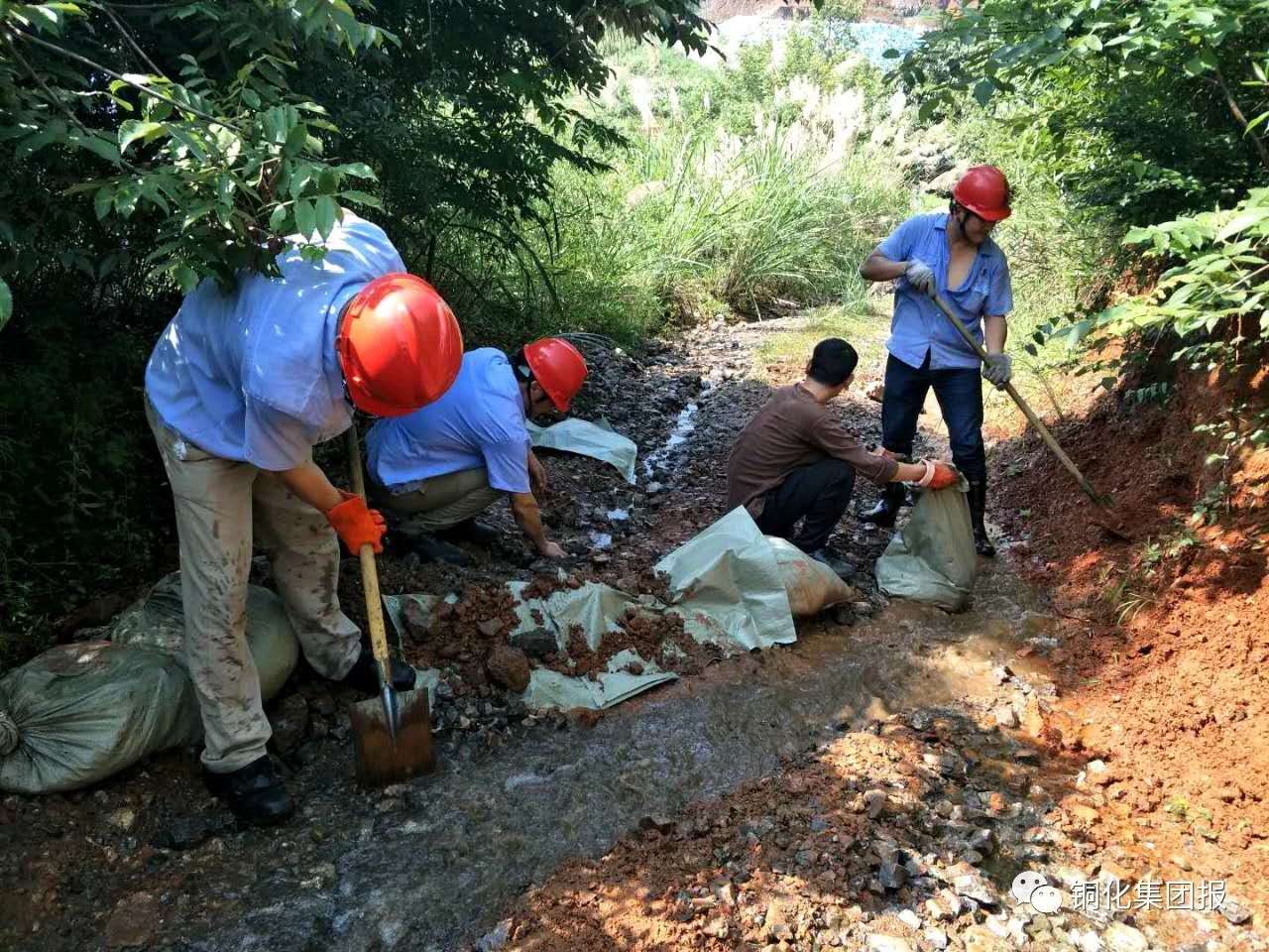 77日,大雨過(guò)后,新橋公司及時(shí)組織人員對(duì)工業(yè)場(chǎng)所和礦區(qū)道路淤泥、砂石、積水進(jìn)行清理,修整,恢復(fù)被雨水沖塌的部分廠區(qū)圍墻和防水壩。期間,該公司黨群工作部組織員工清理副井堆礦場(chǎng)道路兩邊的砂石;選鐵廠組織員工筑壩截水,以修復(fù)被大雨沖塌的圍墻;選礦廠組織員工清理防洪水溝內(nèi)的碎石,確保溝渠暢通。下圖為員工在裝土筑壩截水。喬欣 李霞